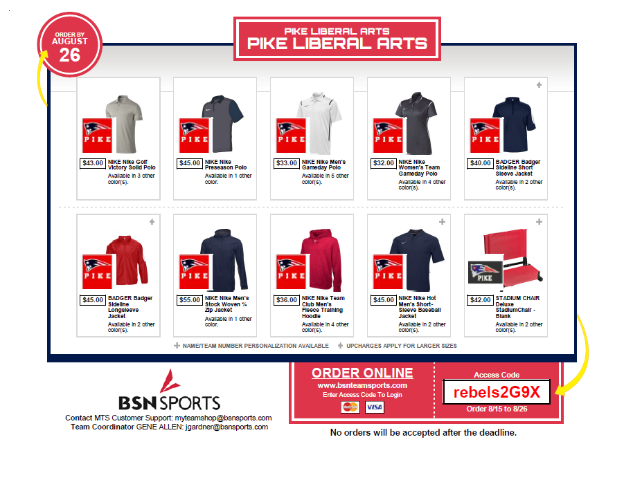The online store for PIKE's varsity football team is open and accepting orders. To access the online store directly, please click www.bsnteamsports.com and then enter the access code rebels4FP