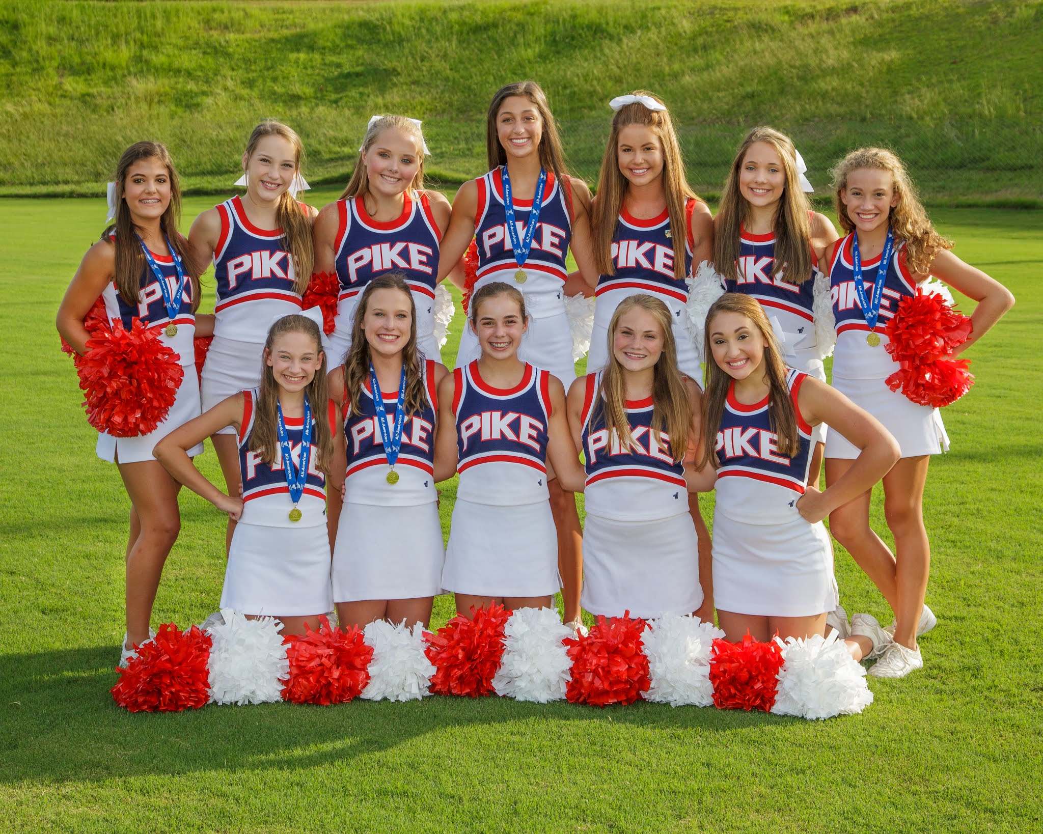 Montgomery – Thursday, July 10th, was a great day to be a Patriot as both varsity and JV cheer teams were named Camp Champions at the AISA cheer camp which was held earlier last week at Huntingdon College. On awards day, all of the Pike family was smiling about how things turned out. The Varsity squad swept the entire camp by taking first place in all 5 divisions: cheer, sideline, gameday, homepom dance, and extreme routine. The Pike Varsity was also named AISA camp champs. All four Patriot seniors made the AISA All Star team. Over 60 girls tried out and only 24 were selected. The four seniors were: Captain Leigh Ann Gilbert, Co-Captain Madison Gilmore, Chaplain Cailyn Barron, and Jessica Knotts. Cailyn and Jessica were also selected as UCA All American cheerleaders. In addition to these great achievements, all four seniors were also asked by UCA staff to try out for UCA. Being asked is a huge honor.